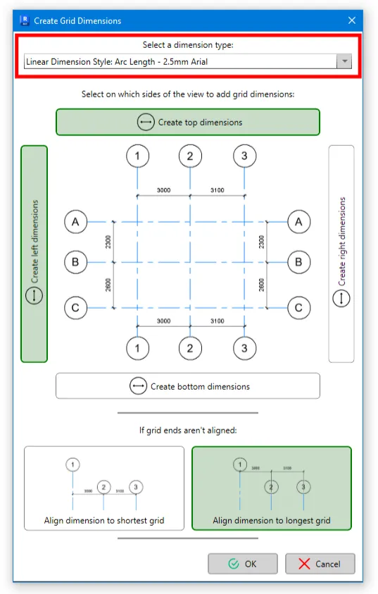 For the final option in this window, consider whether you want dimension lines to align to the longest or shortest grid in each group of parallel grid lines. This is particularly useful for multi-segment grid. In the example below, we chose to place dimensions at the longest grid’s endpoint: