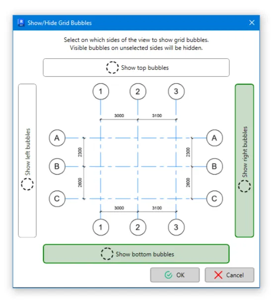 You can then select on which side of the view grid bubbles should be visible. On the view sides not selected, any currently visible grid bubbles will be turned off. Therefore, feel free to select all 4 sides if necessary.